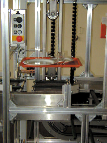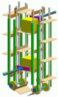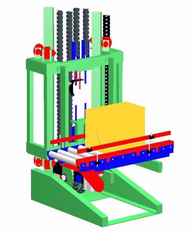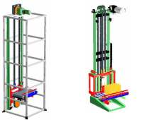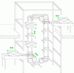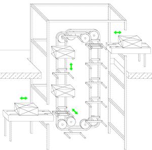 KONZOLOVÝ DOPRAVNÍK KUSOVÉHO ZBOŽÍ (Oběhový) (Fork elevator, Gabelumlauffoerderer) Dopravník slouží k dopravě přepravek z různých úrovní - pater ve směru nahoru nebo dolu. Možno využít několik vstupů a výstupů dle potřeby zákazníka. Rychlost pásu 0.25m/s při maximální kapacitě 1500ks/hod. Hmotnost zboží max. 20kg. Bližší informace o použití naleznete zde: de