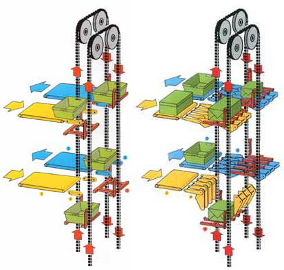 Videoukázka ke stažení zde (*.wmv,10.1MB) OBĚHOVÝ DOPRAVNÍK KUSOVÉHO ZBOŽÍ (circulating conv., umlauffoerderer) Při plynulém pohybu přepravní plošinky umožňuje dopravník vstup a výstup kusového zboží v různých podlažích. Zařízení je založeno na principu ,,pater noster", kdy je plošinka stále ve vodorovném směru. Naložení zboží na plošinku probíhá ve směru zdola nahoru, vyložení ve směru opačném. Kapacita dopravníku až 1200ks/hod, max. hmotnost přepravovaného zboží je 50kg. Produktová řada
